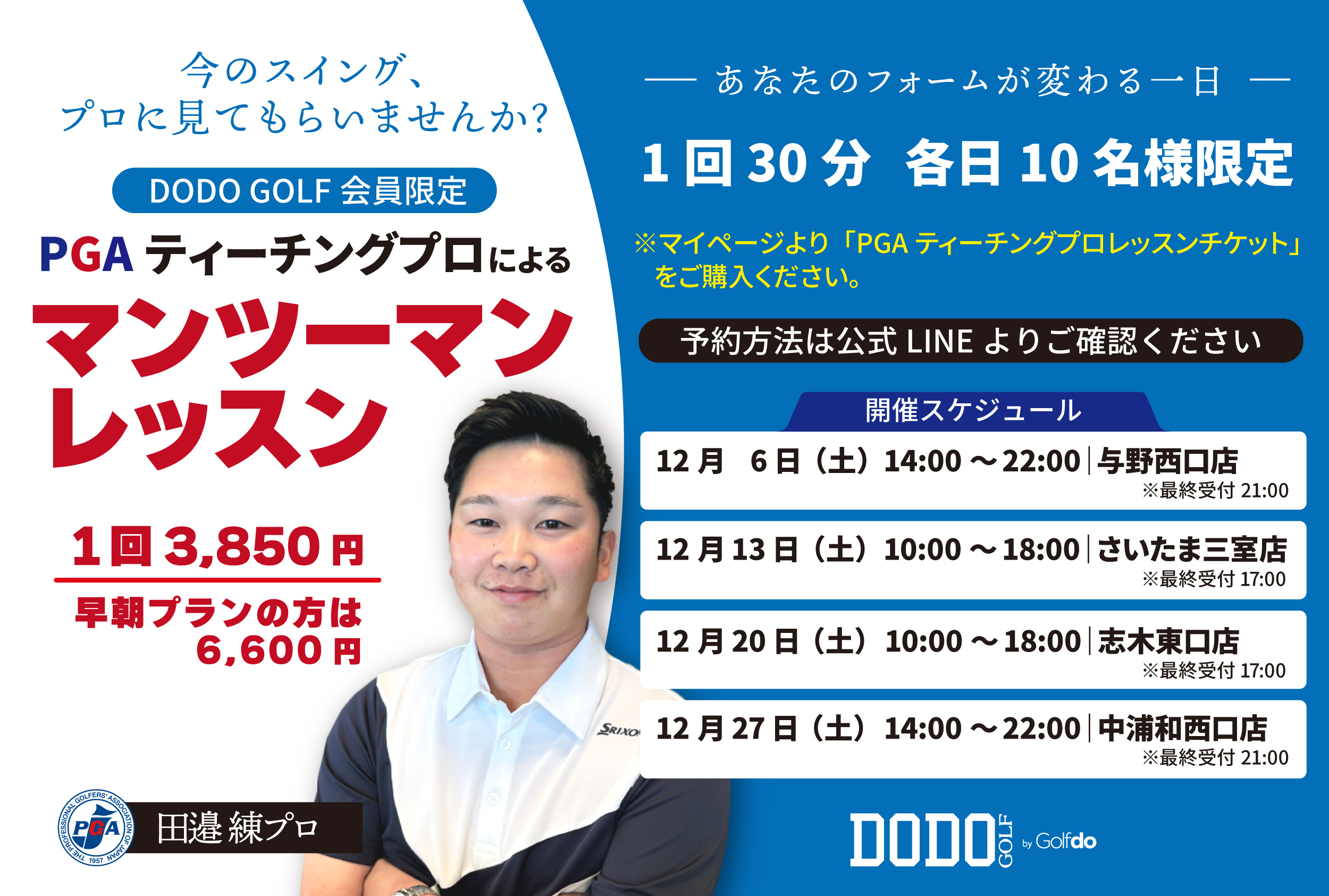 12月のPGAティーチングプロによるマンツーマンレッスンのお知らせ(予定表)