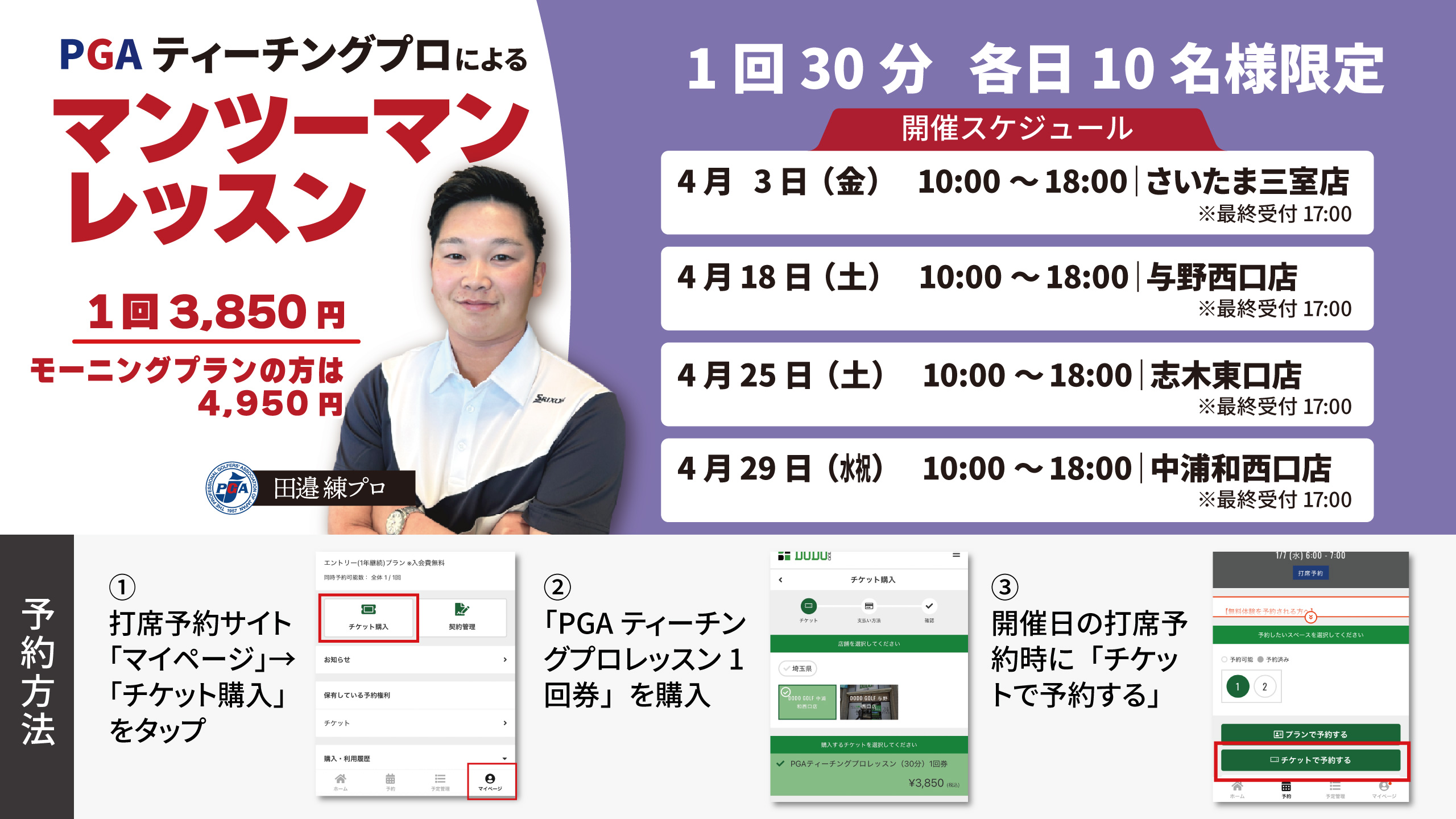 4月のPGAティーチングプロによるマンツーマンレッスンのお知らせ(予定表)